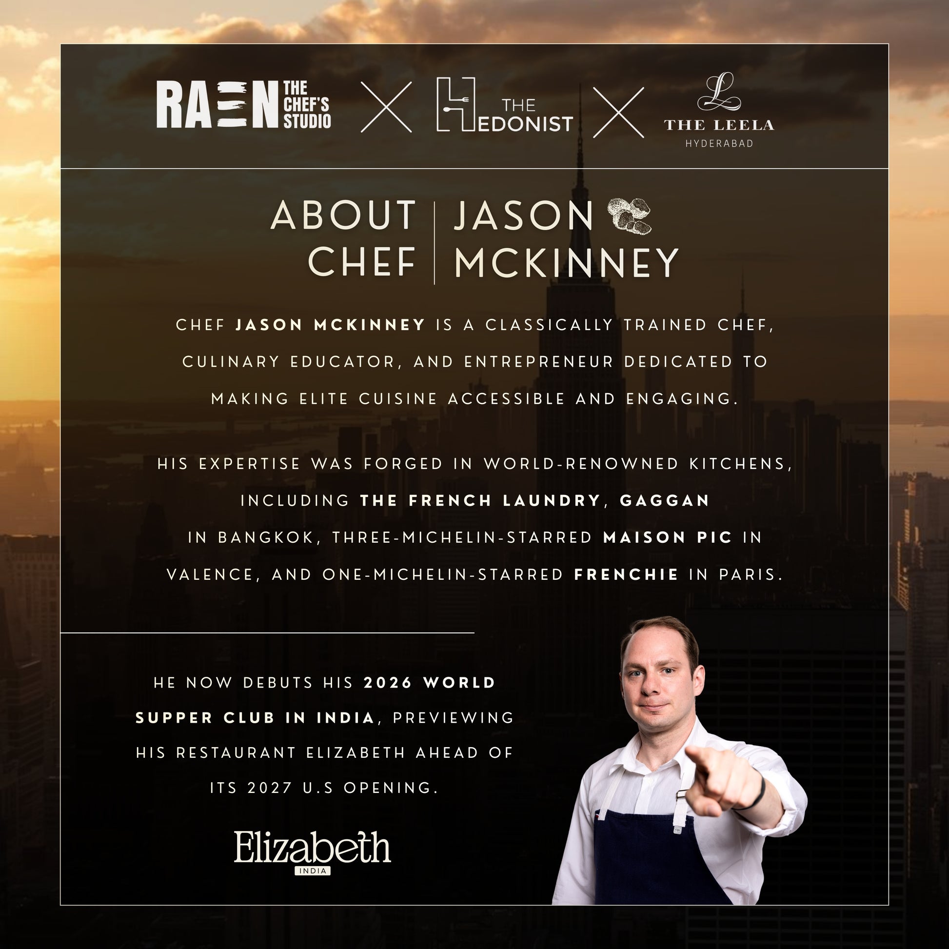Hello Hyderabad! We are back in your city with a super exclusive event : ELIZABETH INDIA TOUR by Chef Jason Mckinney, in collaboration with RAEN Chefs Studio at The Leela Hyderabad.